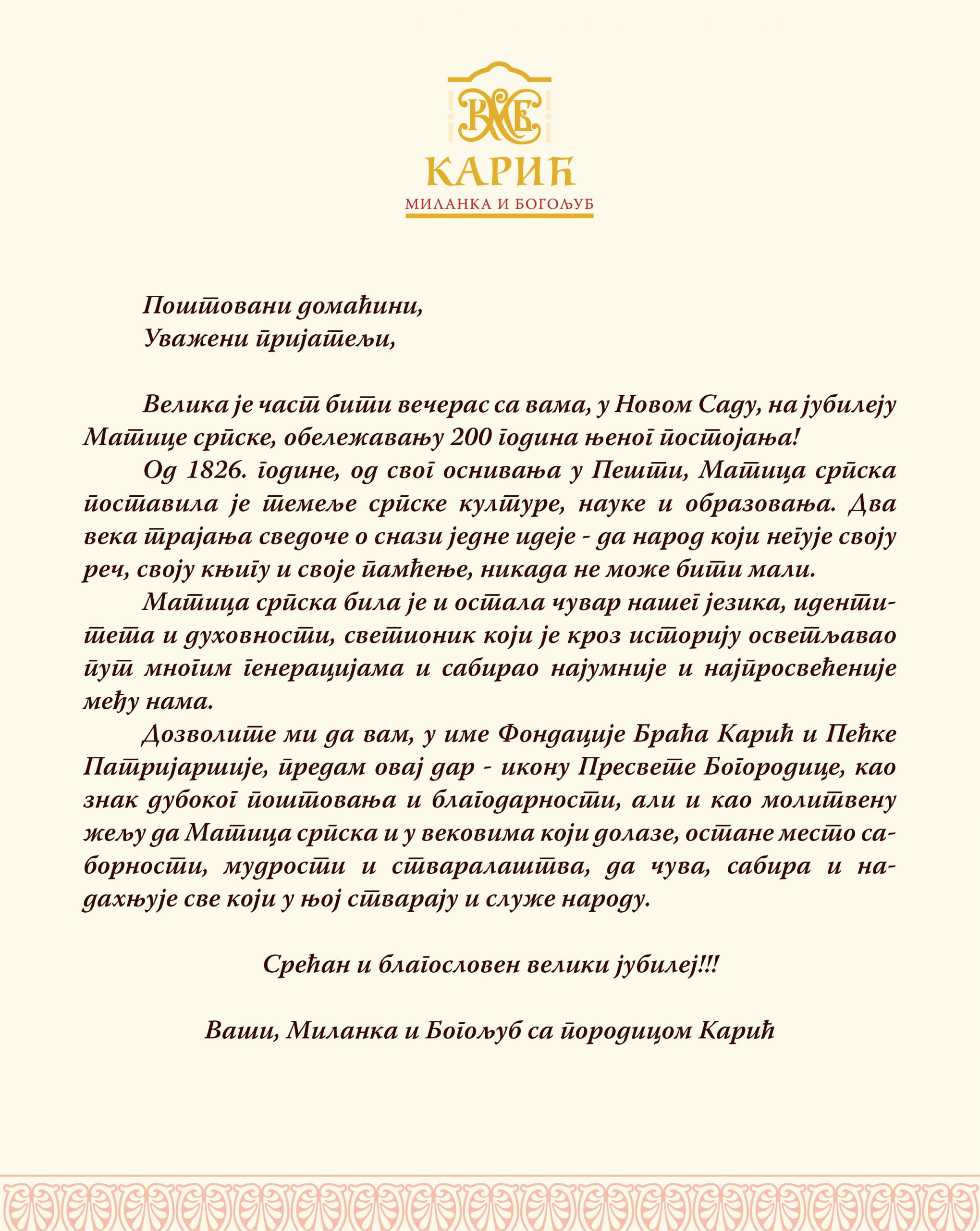 Два века постојања Матице српске, скоро пола века постојања Фондације ‘Браћа Карић’ и четврт века сарадње наше Фондације и Матице српске – за нас су велика част и обавеза.