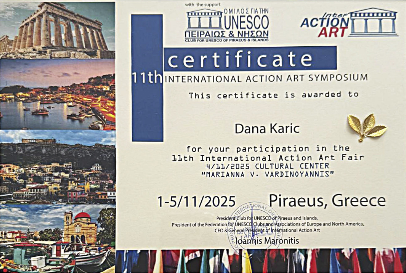 Od 1. do 5. novembra 2025. godine, umetnica i filantropkinja Dana Karić učestvovala je na 11. Međunarodnom sajmu akcione umetnosti (International Action Art Fair), održanom u Pireju, Grčka. Događaj je podržan od strane UNESCO-a i Kluba za UNESCO Pirej i ostrva, a ove godine okupio je umetnike, kustose i ljubitelje umetnosti iz celog sveta, koji su se okupili pod temom „Dijalog među kulturama”.