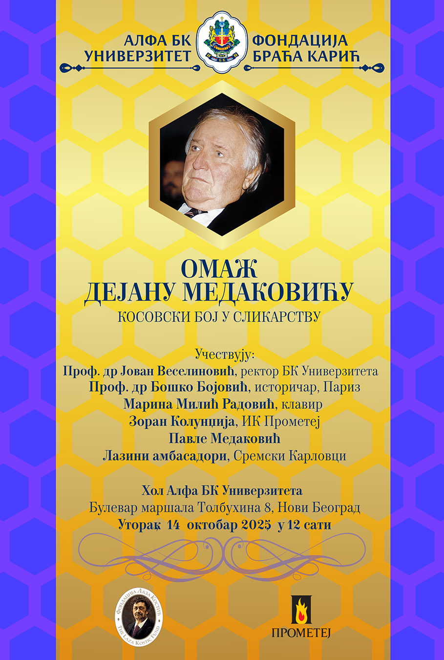 On Tuesday, October 14, 2025, a solemn event was held in the Hall of the BK University in New Belgrade, dedicated to one of the most significant Serbian intellectuals and artists, Academician Dejan Medaković. The event gathered numerous art, culture, and science enthusiasts who, through speeches, musical performances, and exhibitions, reflected on the great work and significance of this scholar and artist.