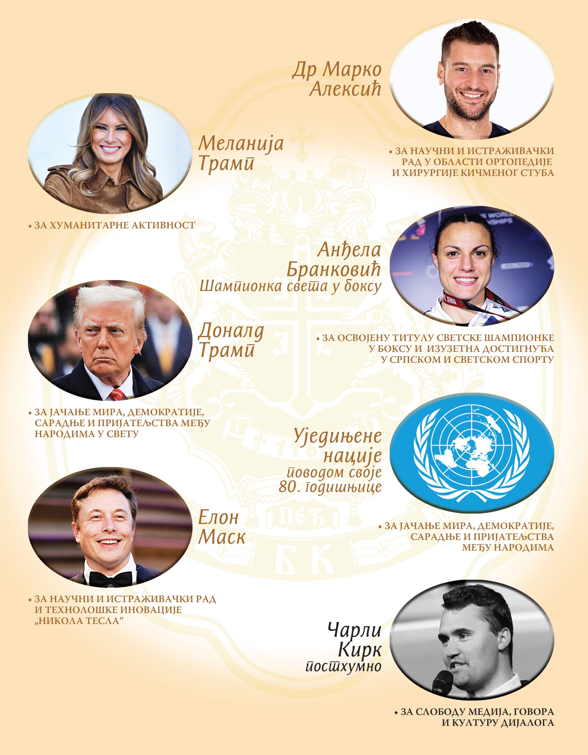 Charlie Kirk (posthumno) – za hrabrost u odbrani istine, porodičnih vrednosti i kulture dijaloga. Ovo priznanje uvodi praksu posthumnih nagrada kao zavet vrednostima koje nadilaze život pojedinca.